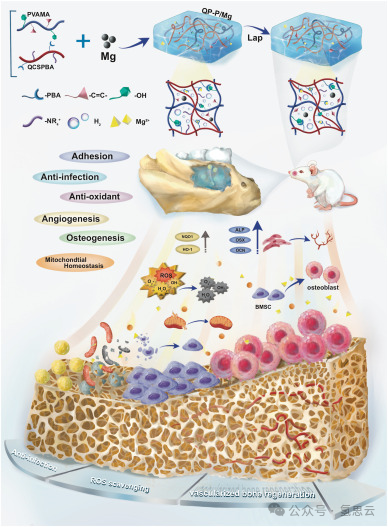 本研究构建了一种靶向ROS介导的感染性骨缺损修复的双网络水凝胶支架(QP-P/Mg)。该支架通过动态硼酸酯键和共价键,将甲基丙烯酸缩水甘油酯改性聚乙烯醇(PVAMA)、苯硼酸(PBA)修饰的季铵化壳聚糖(QCSPBA)与镁微球整合,赋予支架优异的可注射性、组织黏附性、抗菌性、抗氧化性、促血管生成及成骨性能。具体而言,QCSPBA上的PBA基团可与PVAMA上的羟基结合,形成可逆的动态硼酸酯键,使QP-P/Mg具有自修复和剪切变稀特性,从而具备可注射性,以适应形态不规则的感染性骨缺损[24];其次,PVAMA分子间的双键可形成共价交联网络,增强QP-P/Mg的强度和黏附性;第三,镁微球的水解过程受硼酸酯键与Mg²⁺络合作用的严格调控,可实现H₂和Mg²⁺的按需释放,同时避免pH值骤变。释放的Mg²⁺不仅能加速血管化和成骨再生[25-29],还可通过增加细菌膜通透性,与QCSPBA产生协同抗菌作用[30]。综上,QP-P/Mg系统可通过重建线粒体稳态,有效改善ROS过量的感染性骨缺损微环境,并在大鼠感染性骨缺损模型中展现出优异的成骨效果,为未来临床研究提供了潜在价值(图1)。
