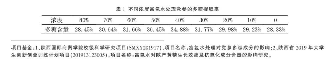 从表 1 看出,随着富氢水浓度增加,党参多糖的含量随之增加,在 50%的时候达到最大值 36.45%,随着富氢水浓度再增加,多糖的含量反而下降了,所以得出富氢水浓度在 50%的时党参多糖含量累计最多。