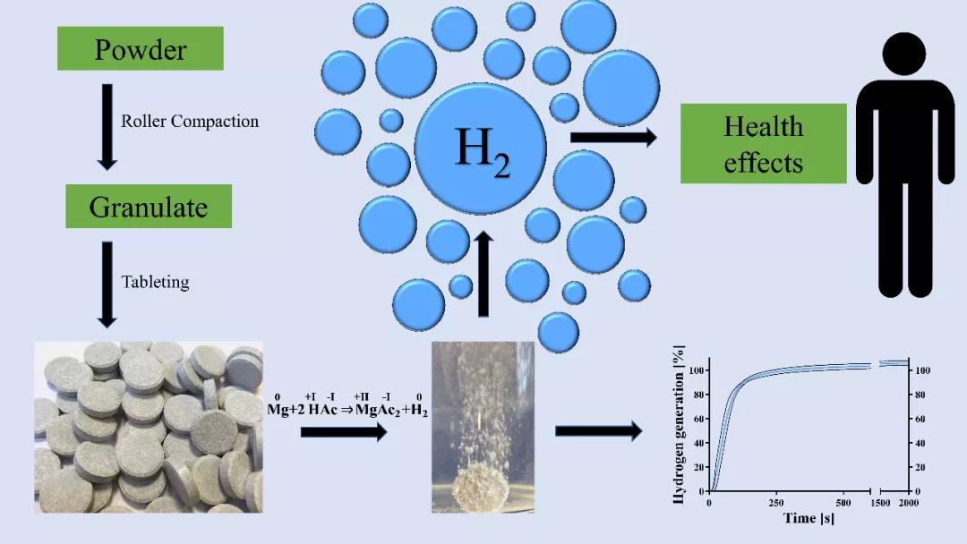 氢分子通过吸入,注射富氢盐水,或饮用富氢水,后者是人类最方便的消费形式。富氢水可以通过加压、电解或泡腾式生氢片溶解和分散气体来产生。我们的目标是开发和表征一种起泡片剂,产生氢气,并具有足够的硬度,允许在进一步加工过程中处理。此外,我们的目标是开发一种药片,满足欧洲监管要求的营养补充剂。与其他制备方法如气体流动或电解相比,片剂有很多优点,可以由非专业人员,更适合作为一种安全、新鲜的富氢水的制备方法。与富氢水相比,片剂所需的运输和储存能力将大大减少。此外,储存富氢水需要特殊的高密度金属袋,这对环境有害。开发出来的片剂还为许多买不起昂贵仪器来制备富氢水的用户提供了氢气。最后,片剂不需要使用电源。