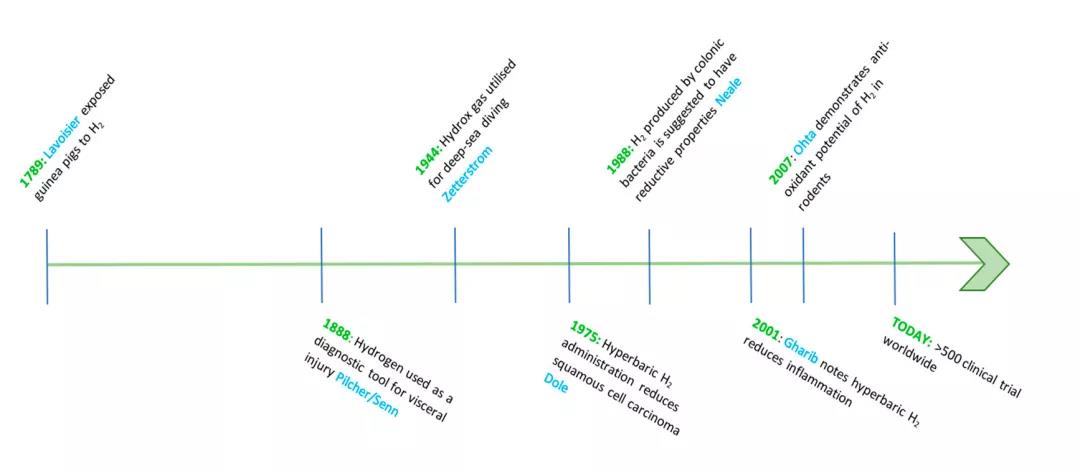 氢气吸入在潜水医学上被证明具有安全性,但直到1975年美国学者才考虑使用高压氢气治疗小鼠鳞状细胞癌,其思路基础是利用氢气的弱还原作用,利用高压提高氢气的效应。这一发现具有革命性,但并没有引起学术界的关注。又过了13年,1988年这一领域才有一篇假说文章发表。文章作者提出,膳食纤维有利于身体健康,膳食纤维可以通过结肠细菌制造更多氢气,这些氢气可以被人体吸收,中和羟基自由基,发挥健康促进作用。(1975年和1988年的论文中都有明确观点认为氢气中和羟基自由基,这和2007年论文的选择性抗氧化并无本质区别)。在这项研究的基础上,Shirahata等认为电解水能产生氢原子,饮用后可保护DNA免受氧化损伤。2001年,法国学者Gharib等描述了在使用高压氢对血吸虫引起的肝硬化具有治疗作用。但是对氢气医学的研究再次中断,直到2007年,Ohsawa等报道了氢气吸入对大鼠脑缺血-再灌注损伤后氧化损伤的治疗作用,并明确提出氢气选择性抗氧化的新概念。这一发现奠定了氢气生物医学的基础,不仅迅速引起国际同行的广泛关注,而且推动了氢健康产业的快速发展。