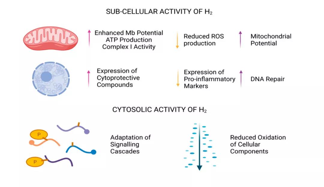 除了在修复细胞氧化还原环境和提高线粒体稳定性方面的角色,氢气已知通过下调促炎分子的基因表达来支持免疫系统,促炎分子会加剧炎症反应。 血红素加氧酶-1 (HO-1)和Nrf-2等抗炎蛋白的同步上调进一步证明了氢气具有多种细胞内效应,但诱导这些效应的具体机制在很大程度上是未知的。先前研究表明,NF-kB上游分子受到氢气的影响,从而对该信号通路产生作用。NF-kB蛋白家族具有相似的同源性,共有300个氨基酸N端DNA结合或二聚域,负责启动炎症因子、趋化因子和粘附蛋白的DNA转录。氢气通过识别一个NF-kB激活的上游事件,推测氢气并非直接与这些蛋白质相互作用。这种抗炎机制可能是直接由氢气与细胞信号事件的相互作用,如蛋白质磷酸化,或通过直接调节氧化应激水平。