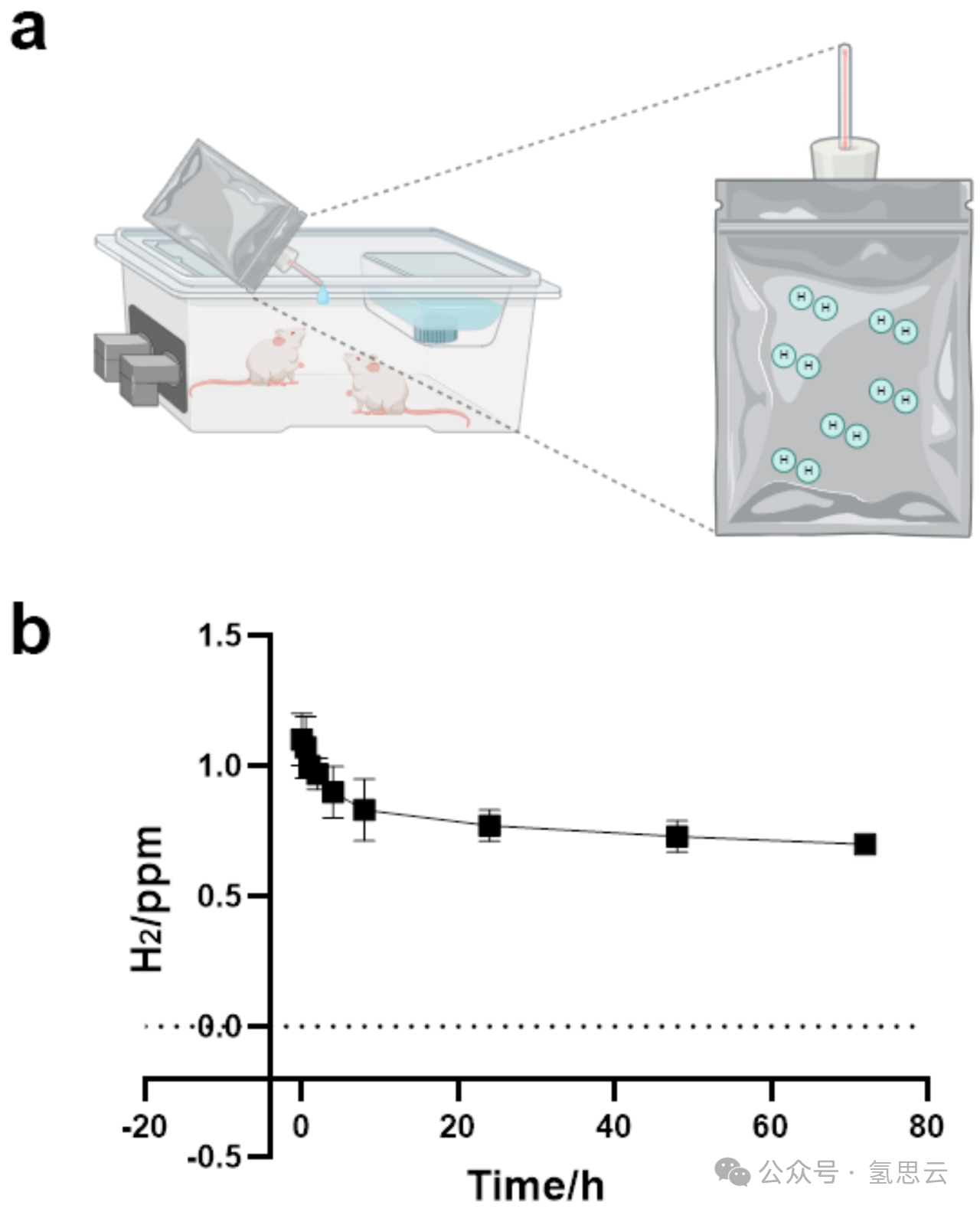 图8. 给小鼠喂食富氢水。(a)小鼠饮用富氢水的示意图;(b)铝箔袋中氢分子的浓度 - 时间曲线。