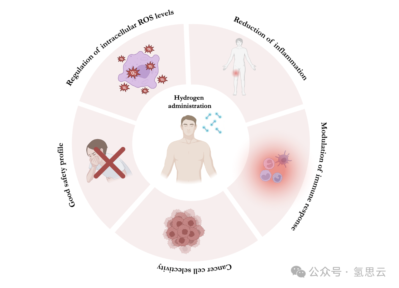氢的施用可通过不同分子机制发挥抗肿瘤作用,包括调节细胞内活性氧(ROS)生成、减轻受损组织的急性/慢性炎症、调节免疫反应,以及对癌细胞比对正常细胞具有更好的选择性,这与该治疗的良好安全性相关。