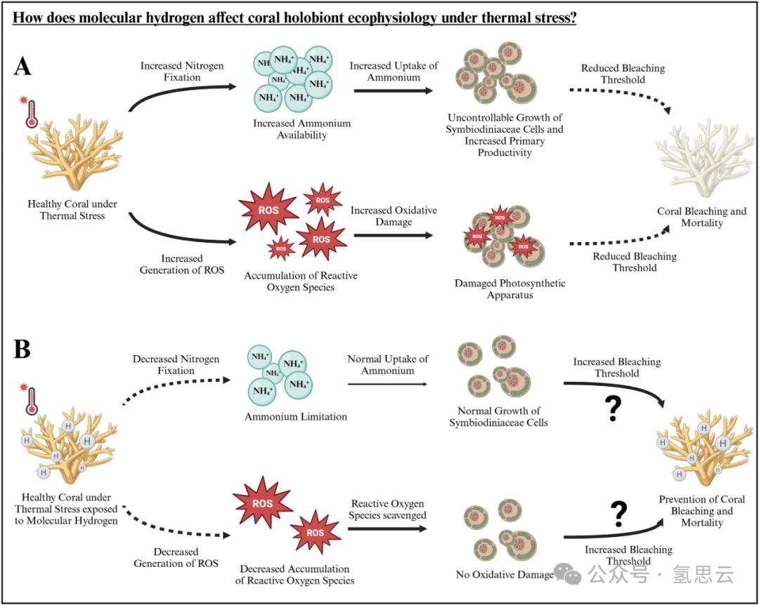 在这种背景下,氢气可能为缓解珊瑚白化提供一种有效的处理方法。由于氢具有强大的抗氧化、抗炎和抗凋亡特性,它已在人类医学中被用作预防和治疗剂 [25-30]。作为一种强抗氧化剂,氢气选择性地还原羟基自由基和过氧亚硝酸盐,它们是最具危害性的活性氧/活性氮之一 [25]。相比之下,其他具有潜在有益生理作用的活性氧/活性氮不受氢气的影响 [25,29,30]。由于氢气也能够迅速穿过细胞膜,它可以成功穿透细胞器 [25],并清除细胞质和线粒体中的活性氧/活性氮。此外,氢气被认为可以通过防止电子从电子传递链泄漏来抑制活性氧/活性氮的产生 [30],调节基因表达 [29],提高整体抗氧化能力 [31,32],并上调热休克反应 [33]。