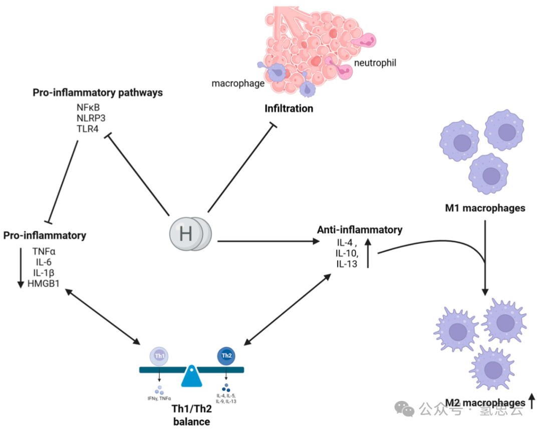氢气(H₂)通过抑制NFκB核转位、阻断NLRP3炎症小体激活和调节TLR4信号传导来减弱促炎信号传导,从而限制炎症介质(TNF-α、IL-6、IL-18、HMGB1)的释放。同时,H₂促进抗炎细胞因子(IL-4、IL-10、IL-13)的产生,这些细胞因子将M1型巨噬细胞极化为M2样表型。这些作用共同帮助恢复Th1/Th2平衡。此外,氢气减轻巨噬细胞和中性粒细胞向细支气管的浸润,减少氧化和组织损伤,防止过量黏液产生,并最终在炎症性肺部疾病中维持肺功能。值得注意的是,与传统抗炎疗法不同,H₂在实现这些效果时不会抑制必要的免疫防御(在BioRender中创建。Pan, I. (2025) https://BioRender.com/mx9zdvq 访问时间:2025年4月11日)。