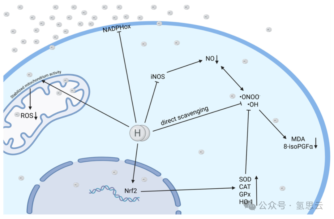 图2. 氢气(H₂)可通过直接清除ROS、稳定线粒体活性、上调保护酶(SOD、HO-1)和抗氧化途径,以及下调产生活性氧的酶(NADPHox、iNOS)来发挥细胞保护作用。H₂具有双重机制——直接清除和酶调节(在BioRender中创建。Pan, I. (2025) https://BioRender.com/qbvn8pb 访问时间:2025年4月11日)。