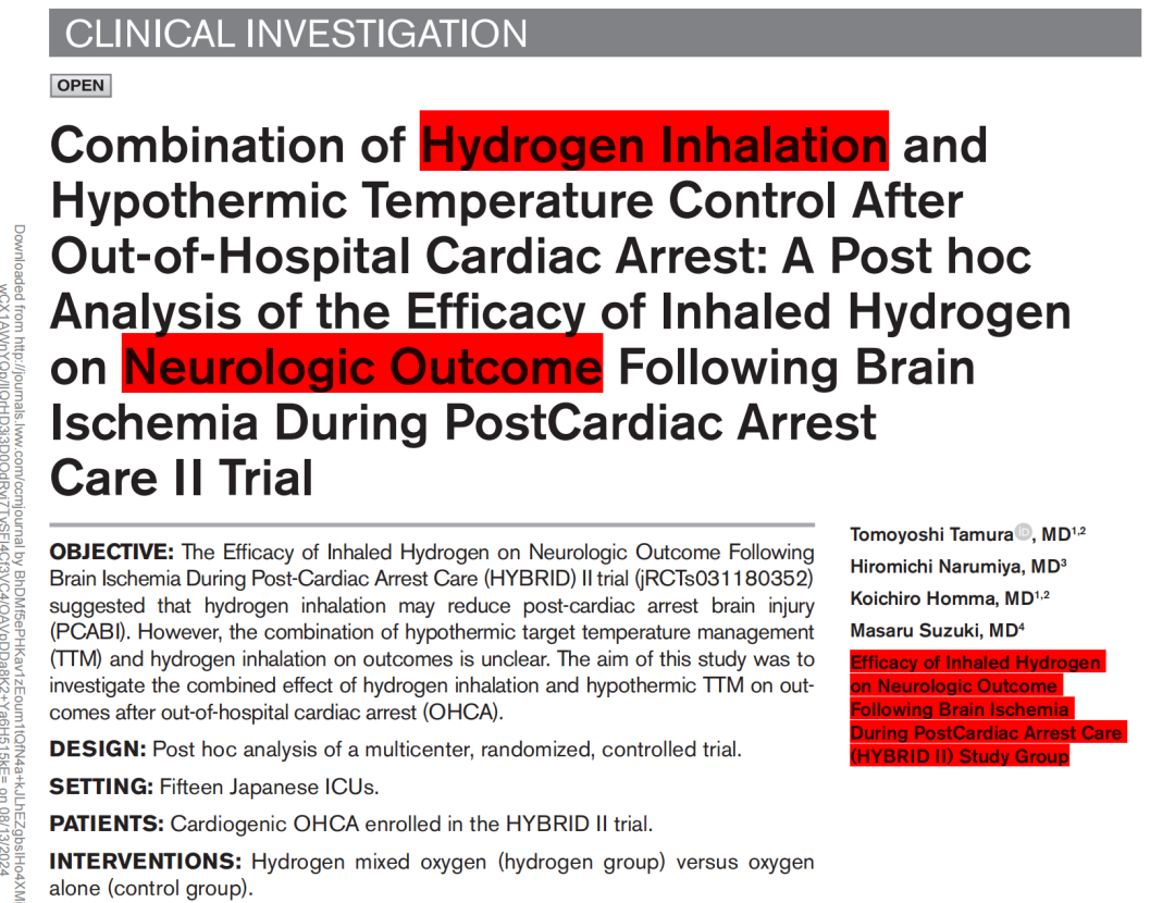本文发表在《重症监护医学》杂志,是日本氢医学研究中最严格最重要的临床试验项目,从2017年开始,2021年受疫情影响提前中断,虽然研究规模没有达到预期数300多人的计划,但仍然获得了明确有效的结论。从这个意义上说,氢气的有效作用远远超过预期。研究从神经功能改善,患者生存率等方面都显示出氢气的作用。更值得重视的是,氢气吸入浓度仅仅2%,氢气吸入时间只有区区18小时。