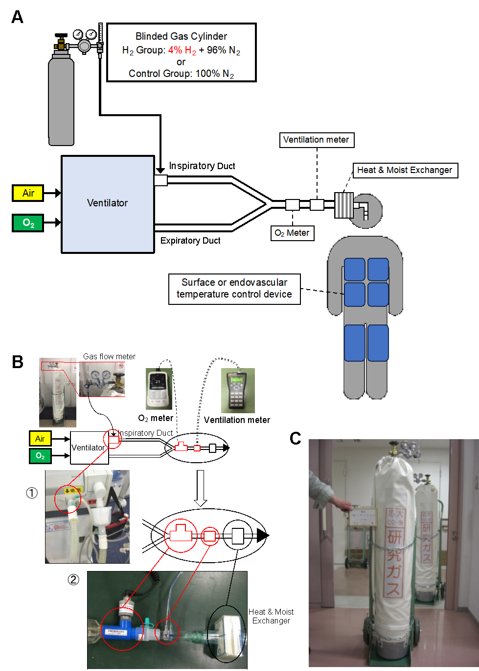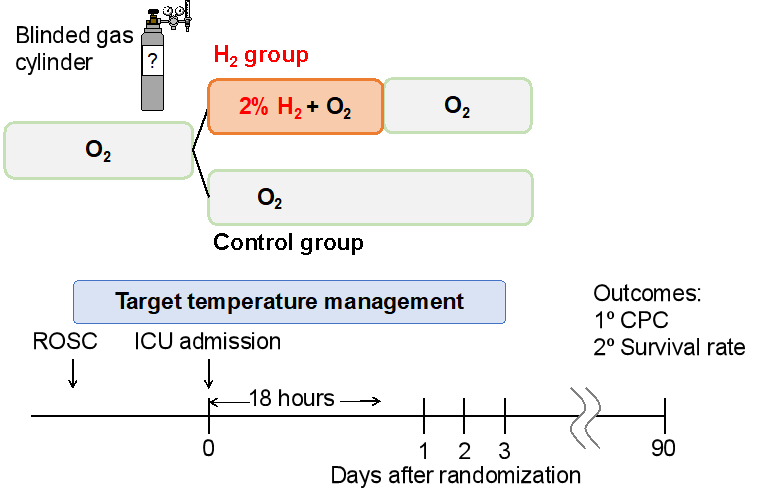 氢气是一种温和的抗氧化剂,它能选择性地减少细胞毒性羟基自由基。氢气具有抗氧化、抗炎和抗凋亡的特性,并可减轻缺血再灌注损伤。我们之前报告过,在心脏骤停(CA)的实验模型中,吸入氢气改善了神经功能和存活率,其中在常温目标体温管理(TTM35–TTM36)和低温TTM(TTM32–TTM34)下单独吸入2%氢气产生了相似的神经保护效果。此外,氢气吸入与TTM32–TTM34的结合在改善神经功能和存活率方面显示出协同效应。最近的一项随机试验,即心脏骤停后脑缺血期间吸入氢气对神经学结局的影响(HYBRID II试验),评估了氢气吸入在改善OHCA后神经学结局的效果。该研究未完成,主要终点未达到统计学意义。然而,次要结果表明氢气可能增加OHCA后的神经完整存活率。在HYBRID II试验中,温度控制在32至36°C之间,但目标温度没有随机选择,而是按照机构协议确定。因此,目标体温和氢气吸入联合治疗对结果的影响仍然不清楚。我们假设,与单独使用TTM32–TTM34相比,氢气吸入与TTM32–TTM34的联合治疗(氢气+ TTM32–TTM34)在改善OHCA后的结果方面具有协同效应。近期的随机试验对CA后的温度控制提出了许多问题,包括最佳目标温度。考虑到复苏后CA患者的大量异质性,TTM32–TTM34可能在一些亚群体中提供更好的神经保护(11,12)。此外,基于临床前观察,单独使用TTM32–TTM34的神经保护可能不是最优的,而氢气+ TTM32–TTM34可能会提供额外的神经保护(7)。为了验证我们的假设,我们对HYBRID II试验数据进行了二次分析,并评估了氢气+ TTM32–TTM34在OHCA后对结果的影响。