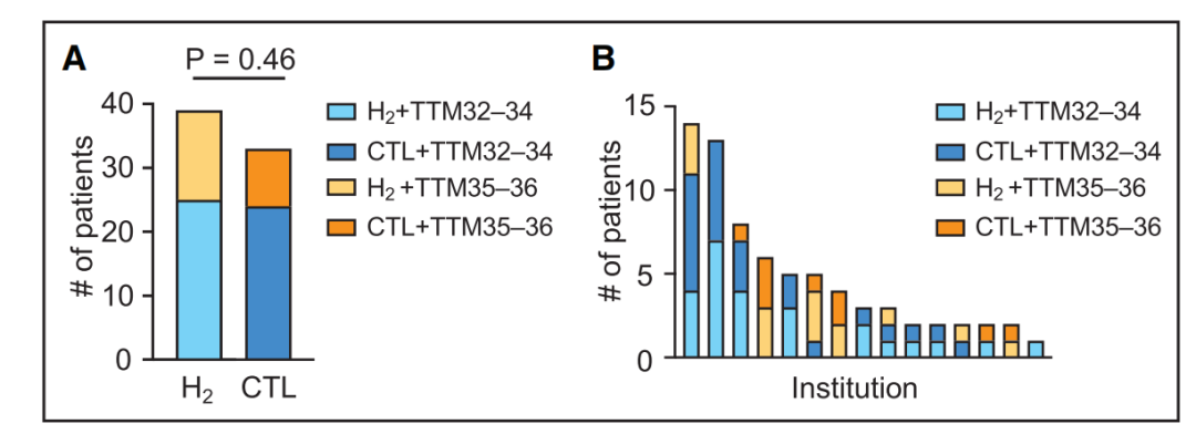 图1. 目标温度的选择。A,在氢气(H2)和对照气体(CTL)组中,主要选择了32°C和34°C的目标体温管理(TTM32–TTM34)。在H2组和CTL组中,选择TTM32–TTM34和目标温度在35至36°C之间的TTM(TTM35–36)的比例相似(p = 0.46)。B,显示了在各个机构中,H2组和CTL组中分别接受TTM32–TTM34或TTM35–TTM36治疗的患者数量。大多数机构将TTM32–TTM34作为机构协议中的默认设置。