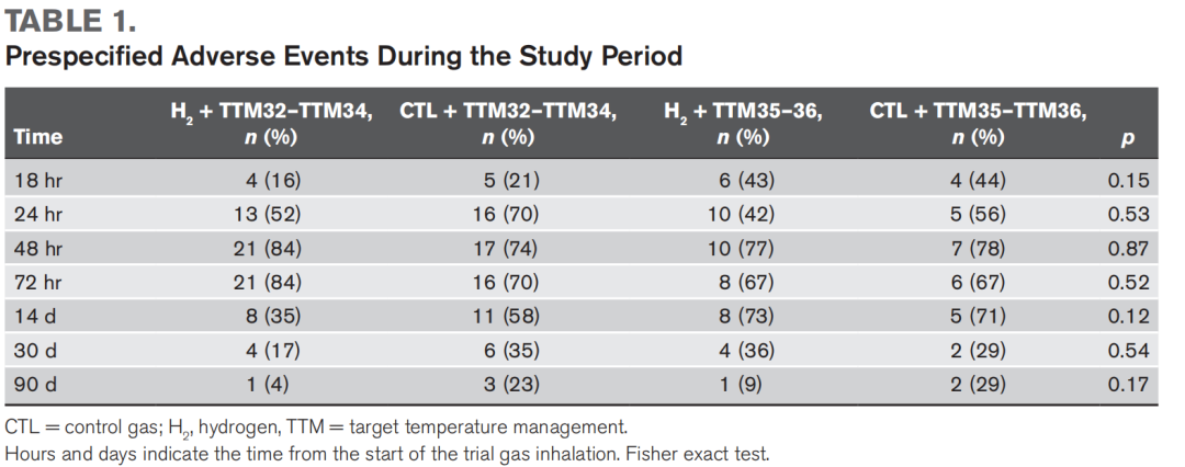 昏迷后的心脏骤停患者处于危急状态,无论采取何种干预措施,他们都面临着发生不良事件(AE),包括死亡的风险。由于没有针对心脏骤停临床试验的AE或严重AE的标准定义,我们根据常见术语标准4.0版为AE定义了一个可验证的测量标准(见补充方法和表S3-S5)。尽管在参与的患者中观察到了几起AE,但在氢气组和对照组中,无论是TTM32–TTM34还是TTM35–TTM36下,AE的发生率没有显著差异(表1;以及表S6-S9)。