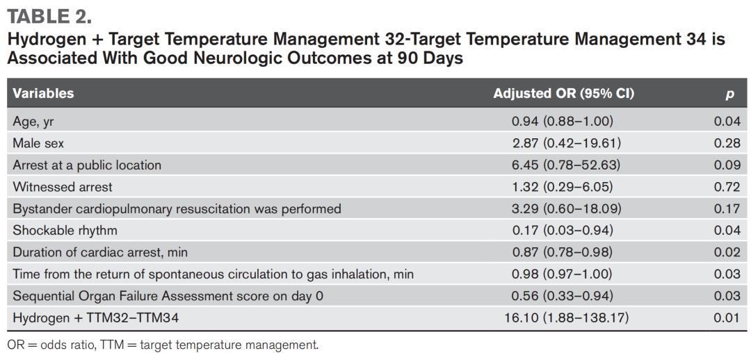 表2. - 氢气+目标体温管理32-目标体温管理34与90天时良好的神经学结局相关
