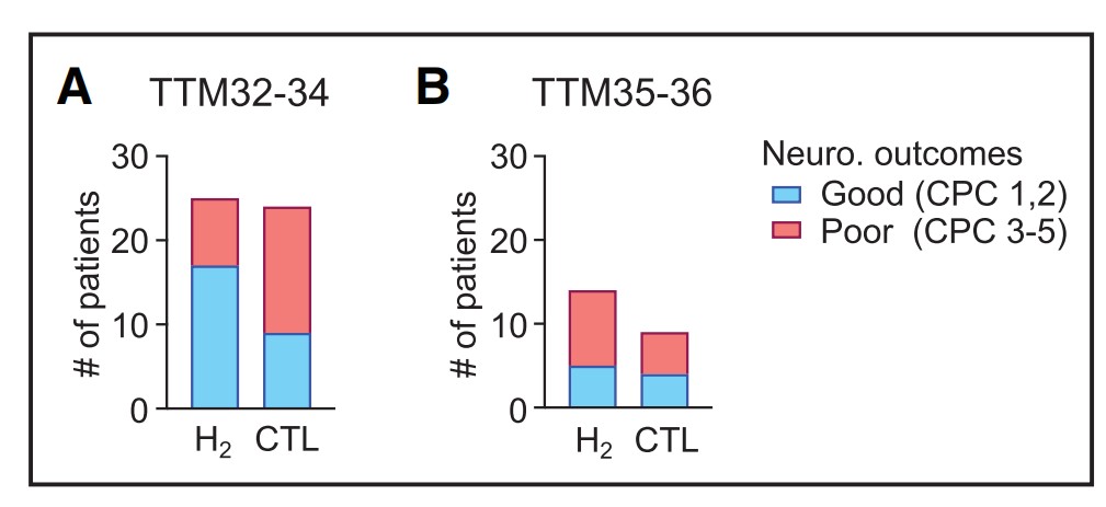 图2.氢气(H2)吸入与目标体温管理(TTM)32–TTM34的联合治疗与改善90天神经学结局相关。良好的和不良的神经学结局分别被定义为随机化后90天时的脑功能分类(CPC)为1或2和3–5。A,显示了在TTM32–TTM34下,每种气体治疗达到良好或不良神经学结局的患者数量。在TTM32–TTM34下,与对照气体吸入相比,H2吸入显著增加了达到良好神经学结局的患者比例(p < 0.05)。B,显示了在TTM35–TTM36下,每种气体治疗达到良好或不良神经学结局的患者数量。在TTM35–TTM36下,H2吸入并未改善神经学结局(p = 0.99)。良好和不良分别表示良好的和不良的神经学结局。CTL = 对照气体,neuro = 神经学结局。