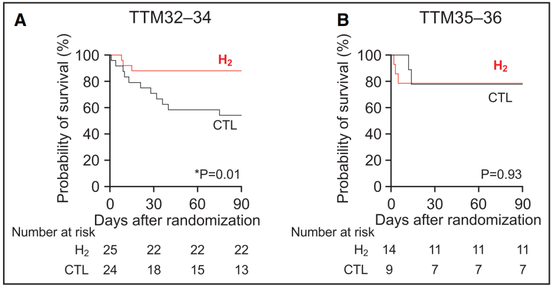 图3. 氢气(H2)吸入与目标体温管理(TTM)32–TTM34的联合治疗与90天生存率提高相关。Kaplan-Meier估计展示了在TTM32–TTM34(A)和TTM35–TTM36(B)下氢气(H2)和对照气体(CTL)的生存概率。事件定义为死亡,数据在每位患者研究期的结束时被截尾,即在90天时。