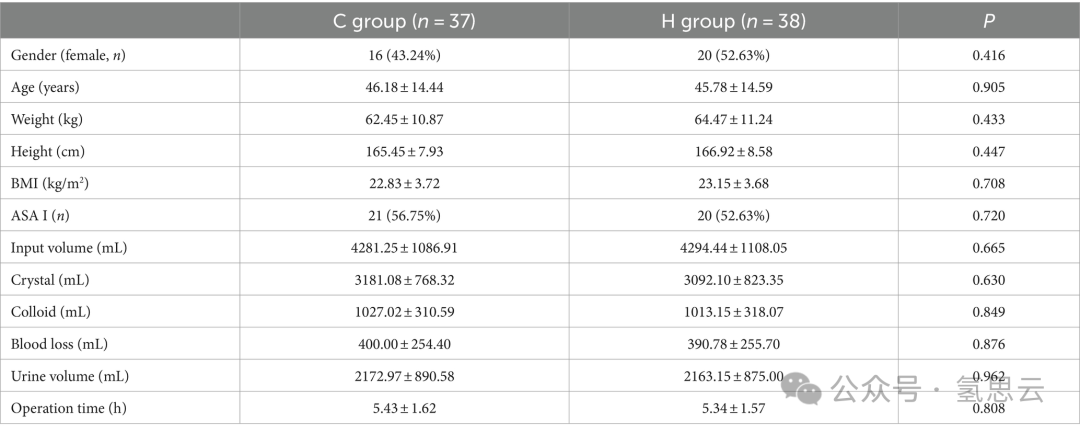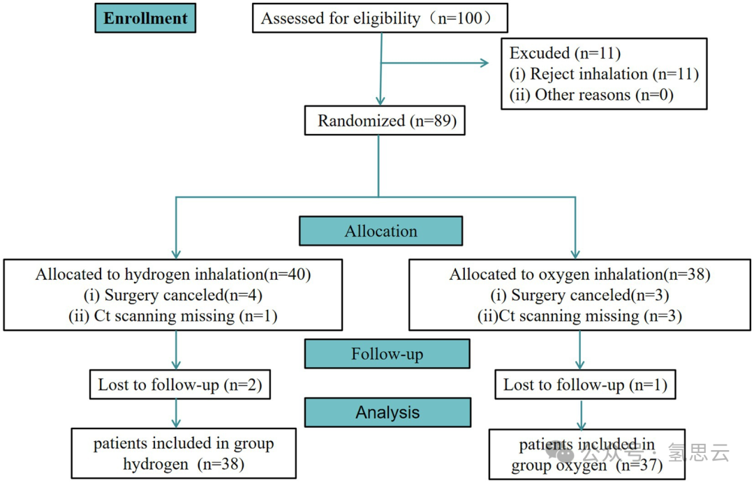 从2023年8月到2023年10月,共有100名成人进行了资格评估。其中,11名患者拒绝接受吸入治疗。此外,89名患者被随机分配到H组(66.7%氢气和33.3%氧气的混合气体)或C组(33%氧气组)。还有7名患者未接受手术。此外,4名患者错过了CT扫描。值得注意的是,75名患者参与了主要分析。然后,有3名患者未完成随访。最后,75名患者被纳入了按协议分析(图2)。