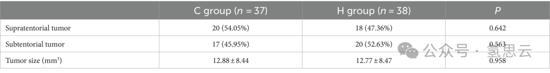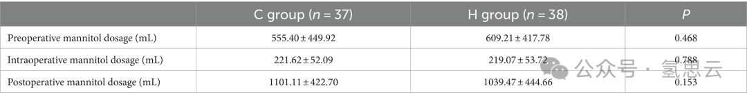 表1、表2显示,两组在术前人口统计信息、术中一般状态或肿瘤位置方面没有显著差异。两组在手术前、手术期间和手术后的甘露醇剂量也没有显著差异(表3)。