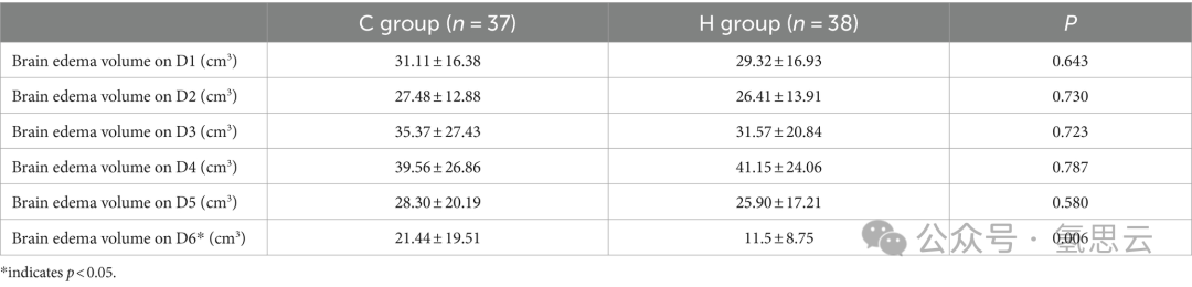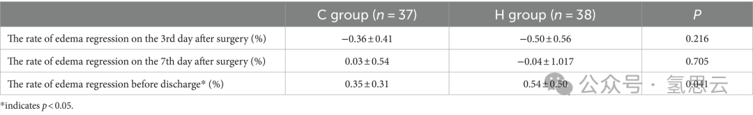 方法:进行了一项单中心随机对照临床试验(中国临床试验注册号:ChiCTR-2300074362),氢(H)组的参与者通过吸入氢气比对照组(C)吸入氧气的参与者更快地缓解了术后脑水肿。