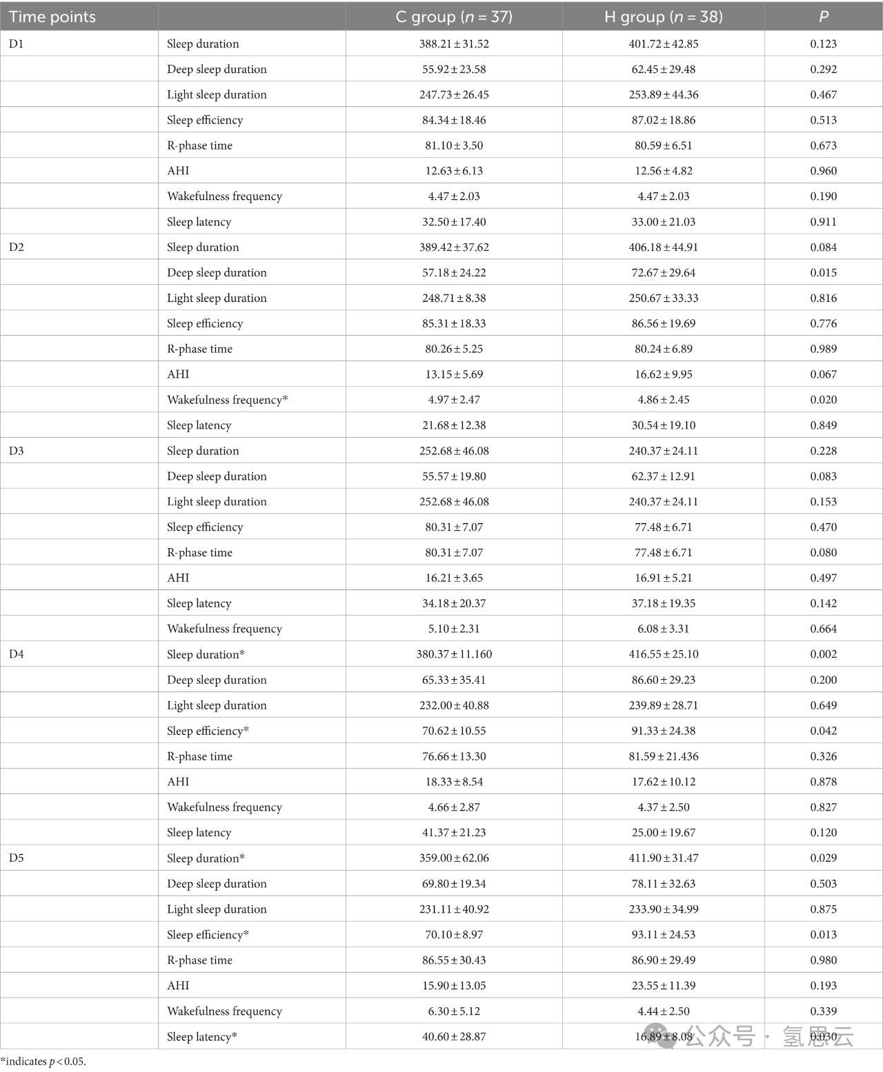 在监测两组之间的睡眠模式时,入院后的睡眠数据没有统计学上的显著差异。然而,与C组患者相比,H组患者在D2、D4和D5的深度睡眠时长和睡眠效率显著增加(p<0.05;表6)。