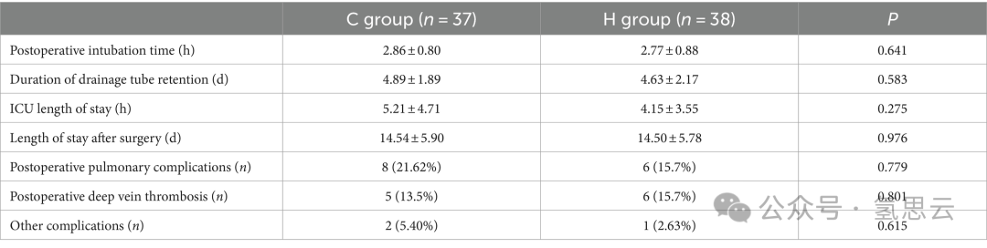两组患者术后住院时间、住院时间、插管时间、手术时间、术后肺部并发症、术后深静脉血栓形成等并发症均无统计学意义的差异(表9)。