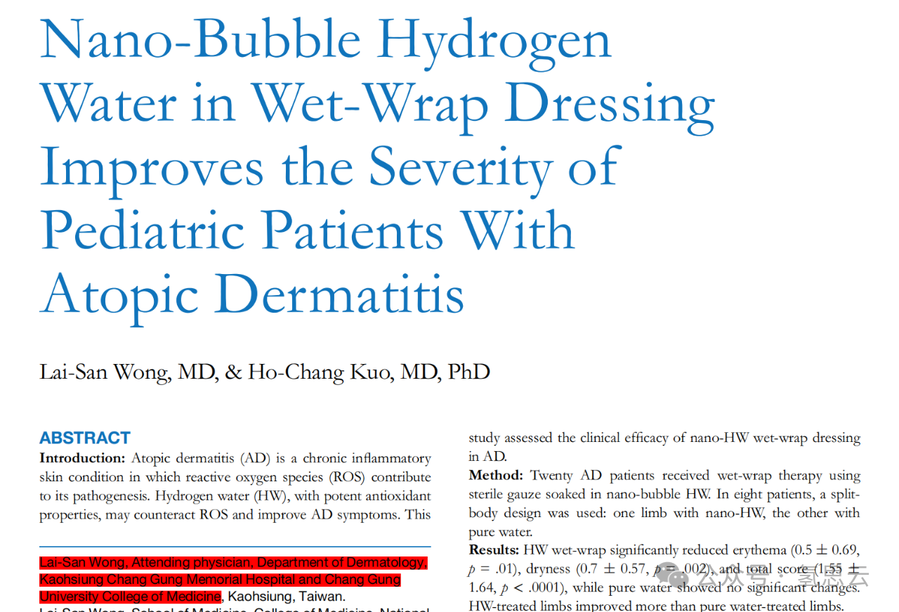Wong LS, Kuo HC. Nano-Bubble Hydrogen Water in Wet-Wrap Dressing Improves the Severity of Pediatric Patients With Atopic Dermatitis. J Pediatr Health Care. 2025 Aug 19:S0891-5245(25)00197-X.