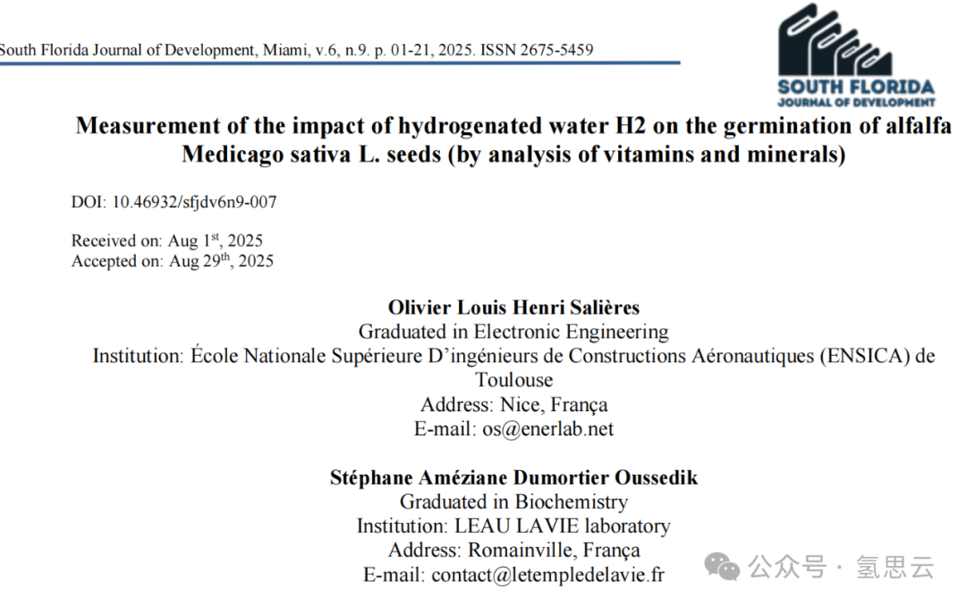 Salières, O. L. H., & Oussedik, S. A. D. (2025). Measurement of the impact of hydrogenated water H2 on the germination of alfalfa Medicago sativa L. seeds (by analysis of vitamins and minerals). South Florida Journal of Development, 6(9), e5768.