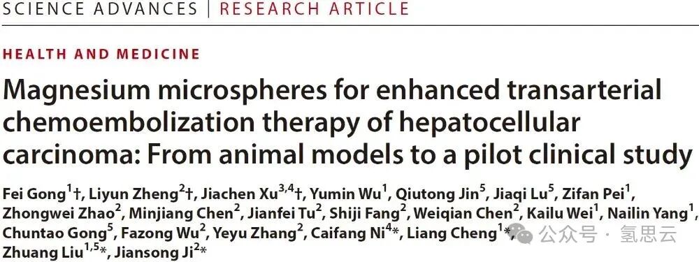 近日,苏州大学刘庄教授、程亮教授研究团队联合丽水市中心医院纪建松教授及苏大附一院倪才方教授在Science Advances上发表题为Magnesium Microspheres for Enhanced Transarterial Chemo-Embolization Therapy of Hepatocellular Carcinoma: from Animal Models to a Pilot Clinical Study的研究。该研究创新性地利用金属镁微球作为一款新型的栓塞制剂,旨在解决临床介入栓塞治疗的问题并提升其治疗效果。