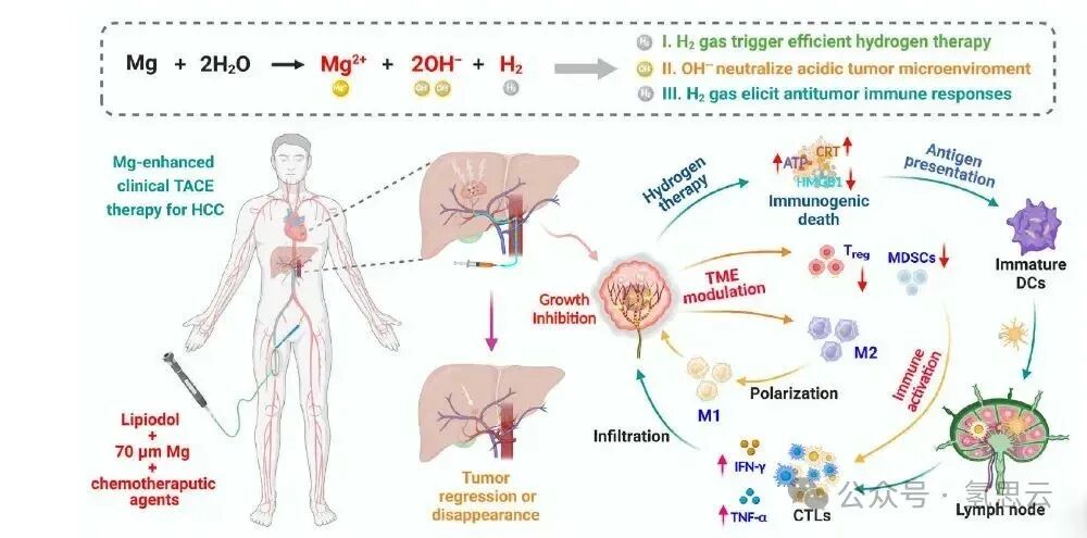 鉴于金属镁材料优异的生物相容性与生物降解特性及其在临床中的广泛应用,研究者团队设计并制备了多种尺寸镁微球,并通过筛选优化获得了70微米粒径的镁微球。这种镁微球可以均匀分散在碘油中,得到的镁微球-碘油混悬液相对碘油而言具有显著提升的动脉栓塞效果,镁微球的存在还可以延长碘油在肿瘤血管中的滞留时间,有利于更有效的栓塞治疗。与此同时,镁微球缓慢反应释放氢气和氢氧化镁,可以中和肿瘤弱酸性、逆转免疫抑制并激活T细胞介导的抗肿瘤免疫反应。在新西兰兔原位肝肿瘤模型中,基于镁微球的新型TACE疗法(M-TACE)效果显著优于cTACE和D-TACE,进一步证实了镁微球增效介入栓塞治疗的潜力。