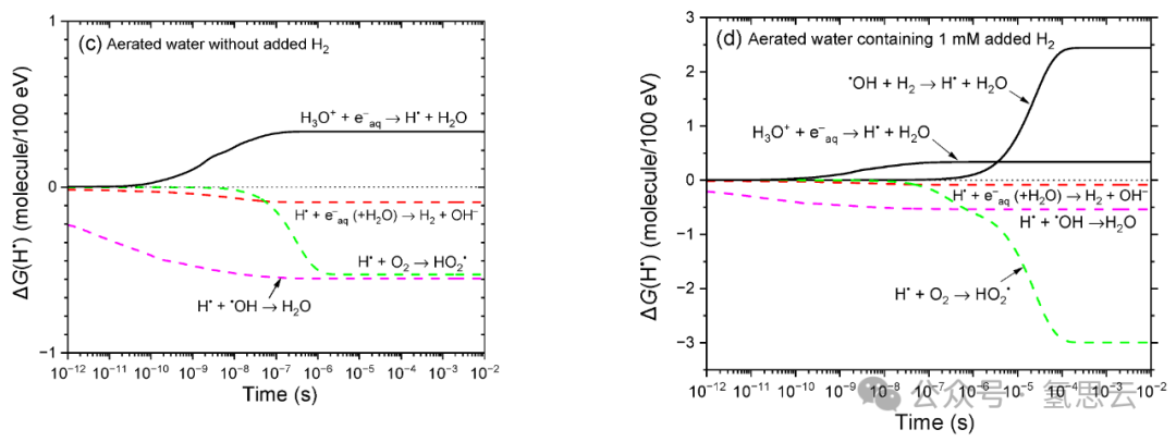 图2a、b对比了25℃下、300 MeV质子辐射作用下,有氧中性水在未添加H₂和添加1 mM H₂时,1 ps至10 ms内辐射分解产物产额的时间演变。与图1a、b类似,添加H₂会显著改变•OH和H•的产额;但在此情况下,溶解氧的同时存在会进一步改变体系——将e⁻aq转化为O₂•⁻,将H•转化为HO₂•。图2c、d进一步阐释了这些效应,展示了蒙特卡罗模拟计算得出的未添加H₂和添加1 mM H₂时,各反应对H•形成与衰减的时间依赖性贡献∆G(H•)。作为对比,图1c、d呈现了无氧条件下的相应结果。