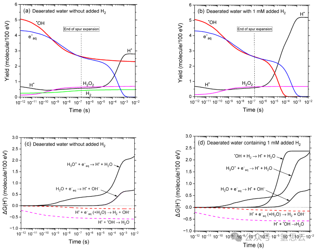 图1 基于IONLYS-IRT蒙特卡罗径迹化学模拟的25℃下300 MeV质子(LET≈0.3 keV/μm)辐射无氧水时,关键活性物质(e⁻aq、•OH、H•、H₂O₂、H₂)产额在1 ps至10 ms内的时间演变。(a)(b)分别为未添加H₂和添加1 mM H₂时的结果。作为参考,约0.2 μs处的垂直虚线表示溶液从非均匀射束动力学向本体均相动力学的转变[53]。(c)(d)分别为未添加H₂和添加H₂时,由相同蒙特卡罗模拟计算得出的各反应对H•形成(黑色实线)和衰减(红色虚线、品红色虚线)的时间依赖性贡献∆G(H•)(详见正文)。**