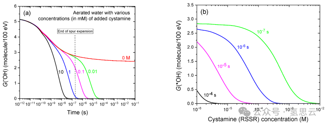 对浓度均为10 mM的H₂和胱胺的抗氧化效率进行直接对比,可进一步凸显二者的差异:在胱胺存在时,G(•OH)从约100 ps时的4.4 molecules/100 eV急剧下降,至约30 ns时几乎降至零;而在H₂存在时,•OH产额的下降起始时间更晚(约30 ns时为2.8 molecules/100 eV),且直至约15 μs时才降至零。这些结果明确表明,胱胺清除•OH的效率显著高于H₂:其反应速度更快,能在更早的时间点清除•OH,即使在较低浓度下也是如此——这凸显了胱胺更优异的抗氧化效率和辐射防护潜力。