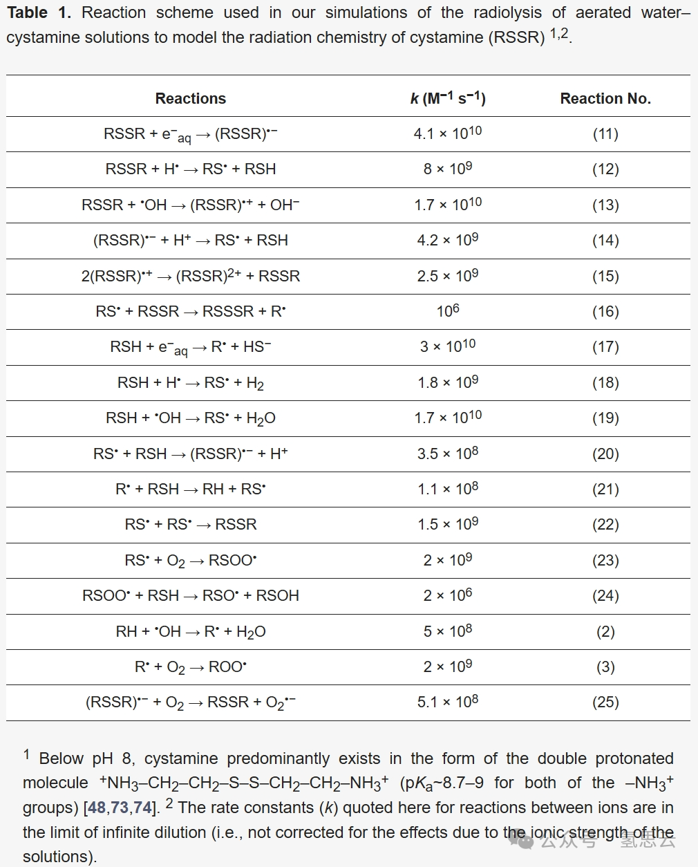 在模拟含胱胺有氧水的辐射分解过程时,IRT程序中采用的化学反应方案、速率常数及活性物质扩散系数,均基于此前对弗里克-胱胺溶液中亚铁离子辐射氧化为铁离子的研究[24,42,48]。值得注意的是,我们的胱胺辐射化学模型无需调整参数,即可准确再现⁶⁰Co γ射线或快电子辐射下硫酸亚铁(弗里克)-胱胺水溶液中Fe³⁺的实验产额[42]。且在广泛的胱胺浓度范围内(无论有无氧气),该模型的准确性均保持一致[42]。模拟得出的G(Fe³⁺)值与观测数据的高度吻合,验证了该反应方案的可靠性。本研究中,水辐射分解反应方案(详见[4]的表14.1)新增了17个化学反应[24],具体列于表1。