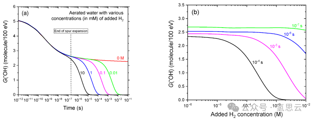 图3a展示了在300 MeV质子辐射作用下,添加不同浓度H₂(0.01-10 mM)的有氧水辐射分解过程中,G(•OH)随时间的演变。结果显示,随着H₂浓度的升高,•OH产额开始下降的时间逐渐提前。下降起始点(定义为G(•OH)曲线偏离未添加H₂曲线的时刻)从0.01 mM H₂时的约60 μs提前至10 mM H₂时的约30 ns。这一现象反映出清除反应(4)的效率增强——在此反应中,•OH被H₂消耗(见上文)。在所有研究的H₂浓度下,几乎所有辐射分解产生的•OH最终都会通过该反应被清除。