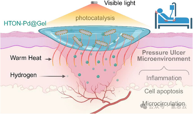 可见光催化产氢/温热联合治疗压疮策略的示意图。在HTON-Pd@Gel覆盖的压疮伤口每日可见光照射下,可见光催化产生的氢气和温热协同改善压疮伤口微环境,包括抗炎、抗凋亡、促增殖、促迁移和促血管生成以改善微循环,支持加速压疮伤口愈合。